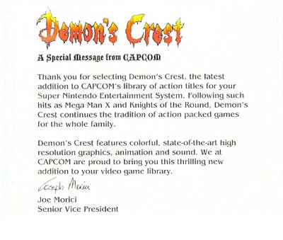The November issue of Gamepro featured a review by, uh, Captain Squideo, and scored Demon?s Crest with a 4.5 for Graphics, 3.0 for Sound, 4.0 for Control, and 4.5 for Fun Factor. The only real negative remarks consisted of a complaint against the menu screen needed for switching between Gargoyle forms, and that the soundtrack was repetitive, and lacked voices for the creatures.