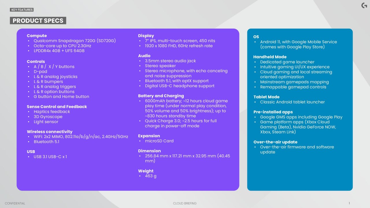 Other info about the Logitech G Cloud’s specs: it has a Qualcomm Snapdragon 720G processor, and a 7-inch screen. You can read all the spec details here.