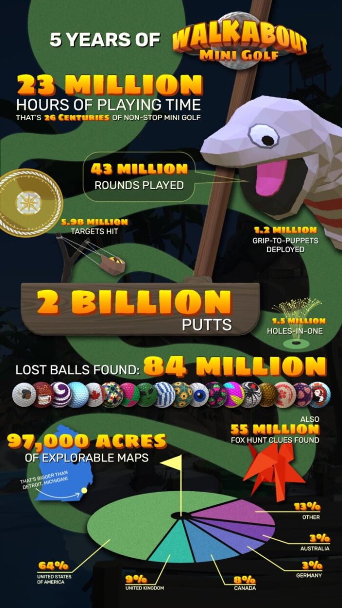 Mighty Coconut also dropped a fresh infographic celebrating the success of the title and stats accrued over the past 5 years since launch. Highlights include 33 million(!) hours of play time, 2 billion putts, 43 million rounds played, 84 million lost balls found and more.