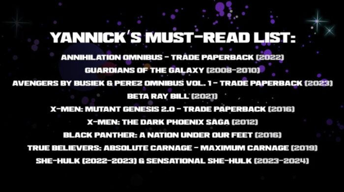 Yannick pretty much had books covering most of the roster, however Cosmic Punisher didn’t get any love and while scanning through the background of the video, a section of the wall did feature books starring the Fantastic Four (Perhaps hints of post release characters…hrmmm?). Also I appreciate that the video closes out with the summary of the books recommended, but as a nitpicking comic fan, the years listed isn’t the original publication of the story, but rather the year the specific compilation was published.