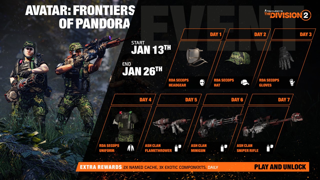 The event starts today and runs through January 26th, 2025 and will offer players the opportunity to obtain a set of Avatar-themed collaboration rewards including the RDA SecOps Uniform along with Ash Clan Specialization weapon skins. But wait, there’s more The Division 2 Sharpshooter, Gunner and Firewall classes all get themed skins as well, and there will also be Named Caches and Exotic Components to acquire during the event.