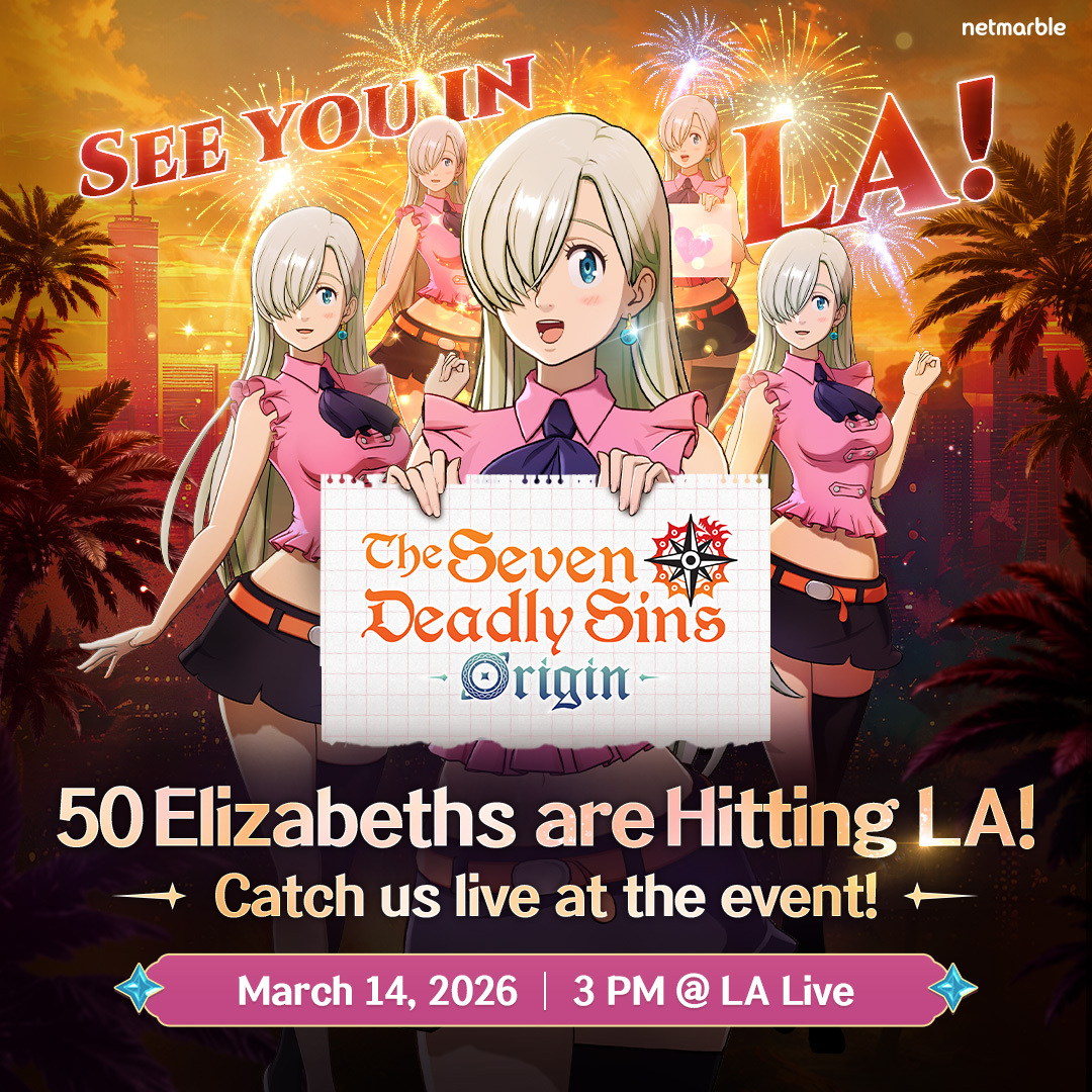 To commemorate the launch Netmarble is hosting a live event at L.A Live on March 14th, which will feature not one, but fifty Elizabeth Liones. For those who are unaware Elizabeth Liones is the character who gathers the Seven Deadly Sins in order to save her kingdom from the Great Holy Knights. Those in attendance can check out a demo of the game, try to win prizes and even take photos with one or even all fifty of the Elizabeths on site (No touching though, she might not mind Meliodas’ grabby hands…but you’re not Meliodas!).