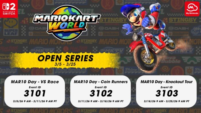 If you own Mario Kart World, you can earn 310 My Nintendo Platinum points by participating in the Mario Kart World My Nintendo Online Series which will be taking place from March 5th to the 25th. The actual dates and the event IDs are shared in the image embedded below.